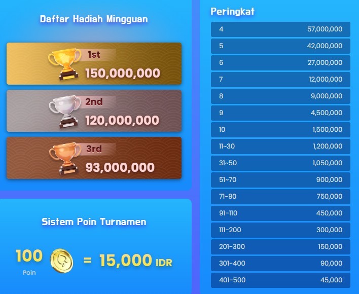 2. Total Hadiah Event ini adalah sebesar Rp 8.560.500.000 yang akan dibagikan kepada seluruh pemenang Tournamen